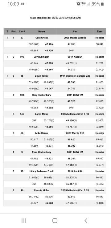 (Thread Starter) | Not Ranked : 0 score Been a while. Lots of life happening, so not a lot of racing this year. But, we have done 3 events and tweaked the car a bit with the intent of going to nationals the first week of September. First event out was mostly a shakedown of the rebuilt trans. I took all of the old internals and put them into a good case. I've done a couple very short change intervals to flush out any remnants of the failure. So far, so good. First event was on asphalt, I threw a string alignment at it and went at it. Local event with 175 drivers, I indexed 3rd, Johanna indexed 10th. Car is respectable and we mostly remember how to drive. 2nd event started with a test and tune on Friday. I had wanted to work with camber this year because I suspected more grip was out there. I started at last years setting of ~-3.0° front, and -3.5° rear and got a couple baseline runs. We added a net of -0.4° camber to the front end after zeroing out toe, and it completely woke the front end up So much added that we needed to hunt for rear grip. Added -0.4° out back and we're back to a balanced setup.If some is good, more is better, amiright? We added nearly everything the front end has available, around -0.7° more. That much was not better, lol. Braking suffered and it was too easy to lock up a tire. The lateral grip didn't suffer, but turn in was pretty dead. So, no tnt time left, we backed out 0.3°, which should be around -3.7° in the front and -3.9° out back. I'll get it on a rack to verify. So, we skipped Saturday and ran sunday competition. Concrete site, and the car ran great the first few runs. About 4 runs in we lose rear drive and I have some suspicions of what it is because the car doesn't make ugly sounds like things are broken. Load it up and call it a day. Had I not coned away my fast run, the car was on target to be the fastest car there. Index and raw. The car is working (when it has rear drive). Suspicions confirmed back home, but i was wrong about which one it was - the drivers front wheel speed sensor had vibrated out of place because the alignment peg has been broken for about 5 years. Easy fix, but we corded the front tires due to wheel spin in fwd mode. That brings us to this past weekend - Peru Champ Tour. I had intended to run my normal ESP class, but it turned out that we only had 2 cars actually showing up in ESP. That means no possibility of contingency payout, so lots of back and forth with some other folks, and all of ESP decides to roll the dice with Street Mod (a significantly faster class). So, 2 drivers in SM, 2 from ESP, and it turns out that ASP and DSP had the same idea, so we have a 9 driver class in SM, with ESP being the "slowest" of the bunch haha. Johanna is gunning for Ladies index, so she'll run ESPL by her lonesome. First day, first run, I lay down a FLYER. It was damn fast, but with a cone. I think the competition sees this. No one is close to that time, yet. 2nd run I clean it up but am 0.2s off of my first run, but still damn fast and no one is near it. Lots of cone calls on competitors and I'm in the lead. Third run is slow, but no one goes faster so I'm leading by 0.4s going into the 2nd day. 2nd day, first run feels ok but I'm not pushing the car hard in some key sections. The competition is clearly faster today, but with my lead and yesterday's cone calls, I think I have a shot. 2nd run (video below) feels better and is 0.7s faster, but still slow in 1 section that i shouldn't be. Third run i try to go flat through the slalom end offsets and bail on it after upsetting the car. Competition still had a chance, but no one can close the gap and I take the win in street mod Johanna takes the ladies index win by a pretty solid margin in the last heat of the day. The car rips.Coming up, we have a 3 day local event that we'll use as final Nats prep. Friday the 16th is Test and tune and I want to dial in camber and tire pressures. The high speed rear grip could be better, so I'm going to work on that if the course allows. The 17th and 18th are competition and we'll clean up any remaining issues (car and driver) with those days. Sent from my SM-G960U using Tapatalk