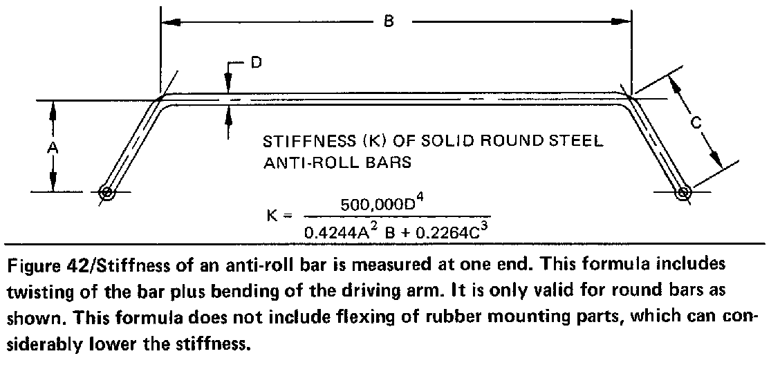 Reading this page now, there is confusion about what the proper sway-bar rate calculation is, because of an error in the first equation posted by Phate in post 82. That is an excellent derivation of Fred Puhn's equation by M. Iacchei that I have seen before, but never noticed the error in the numerator; it should be 500,000, and not 5,000,000. Inquisitive had a great explanation of this error in post 94. This is the correct formula, reprinted from Puhn's book: http://v8sho.com/SHO/images/Image48.gif This is an online calculator that works well: http://www.gtsparkplugs.com/Sway-Bar-Calculator.html Maisonvi has a link to his spread sheet in post 86. The equations are correct, but the current modulus values he used are low by a factor of 10, reducing rates by the same factor ... too soft. The Puhn formula is an estimate of the bench rate, and the A,B, and C dimensions are the centerline values with "ball joint" type supports at the intersections shown on Puhn's image. The typical bushings can drop calculated stiffness by 30%! When Phate mentions bench rate, that is what the Puhn equation represents, a bench test like he did. I derived the formula to be sure it made sense. It considers: 1) the twist in the bar 2) the lever arms "rigid" deflection due to this twist 3) the bending in the lever arms, as cantilevered beams The Puhn "bench rate" equation represents the wheel on one side moving up or down, while the wheel on the other side does not move. When considering wheel rates while cornering, you must multiply the Puhn spring rate by 2 . "How to make your car Handle" by Fred Puhn --- excellent for the basics .