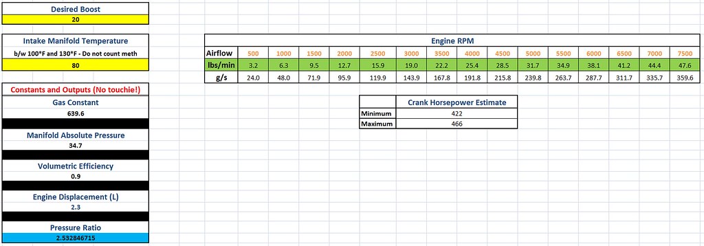 Though it is bang on for the upper RPMs, things aren't as *constant* across the board. At first thought, VE is assumed to be 90% across the entire rev range but in reality we know that not to be true. Assuming VE is the culprit in the calculations, actual VE would have to be higher in order to shift flow values to the right to ensure we're not surging. Perhaps VVT comes into play as well and we can't forget about cams... I do like cld12pk2go's comparo tho. Using actual values to plot does make sense instead of using theoretical values since we can get them. I'm going to have a look at a datalog when I have a chance to see what's what. Theoretically, I should be *safer* with my compressor map lying slightly to the left vs the GTX3071. Sent from my iPhone using Tapatalk