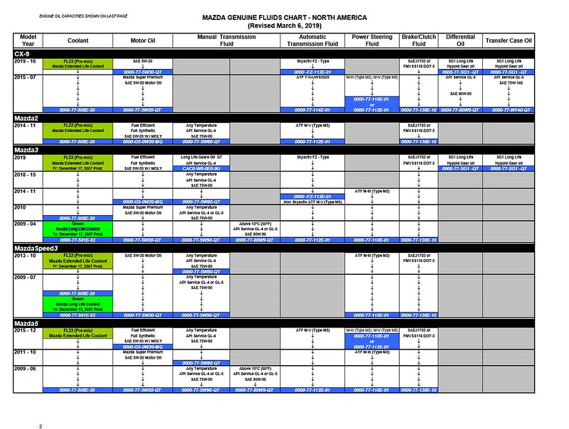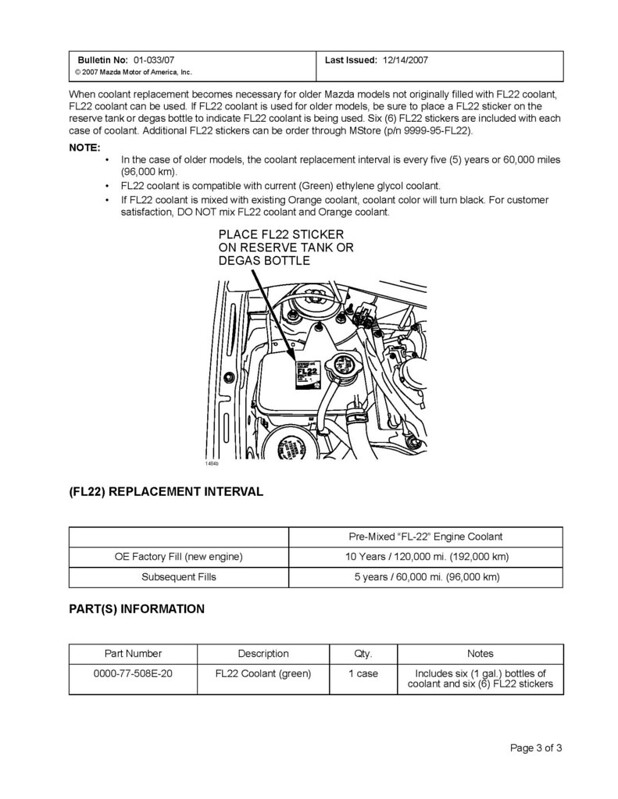 | Not Ranked : 0 score From @TiGraySpeed6 on the mazda6club forums MS6 Fluid Notes & DIY Pictures - Mazda 6 Forums : Mazda 6 Forum / Mazda Atenza Forum > Coolant '06 MS6 Manual - 8.5 us qts (2.25 us gallons) Type- Mazda FL22 Mazda OEM - part# 0000-77-508E-20 Ford Specialty Green Coolant - Motorcraft part # VC-10-A or VC-10-A2 - $27.59 gallon 50/50 mix Zerex Asian Vehicle Coolant - NAPA Part # ZRX 675130 - $13.99 gallon of 50/50 mix It seems that only Mazda has coolant called "FL22" - - Well, OK then, just WTF is FL22, and is this going to be a PITA? Some clarity, compliments of the BobIsTheOilGuy forums, and a poster named ponderosaTX: