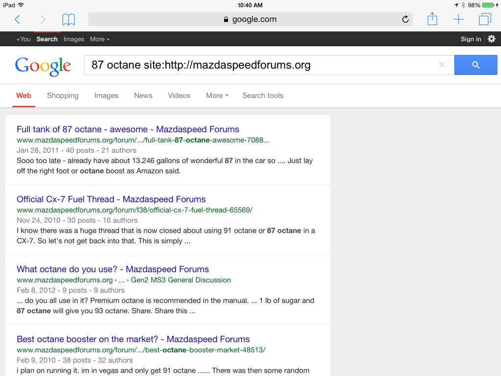 Wasting time would be answering hypothetical questions all day. We believe in the teach a man to fish philosophy here so we encourage new members to search for their answers. Every question you'll ever have has likely already been answered on here. Case and point: First result after I searched for "87 octane" in the search box: ![]() I think you'll find that thread useful. Sent from my iPad using Tapatalk