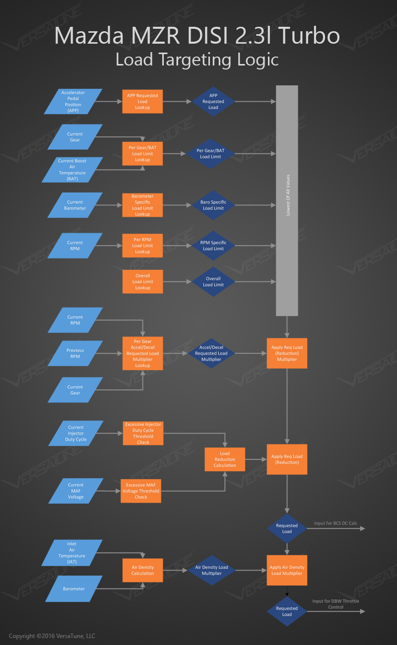 (Thread Starter) | Not Ranked : 0 score Over the years, I've answered quite a few questions on how exactly the Mazda MZR DISI 2.3l Turbo load targeting logic works. So, I thought I'd take some time to put together a clear diagram showing the load targeting logic. For those used to simpler but less consistent boost targeting, this may be helpful when converting to a load based tune. The process starts with the accelerator pedal position (APP) input. APP and the current gear are the only input that the driver controls. The ECU looks at RPM, current gear, boost air temperature (BAT), and barometer (Baro) and does table lookups to find load limits for each input. It then compares all of the limits against the requested load from the APP requested load lookup table and returns the lowest value of them all. Next, the ECU applies load reduction if necessary to prevent overboosting when shifting up or down. The inputs for this lookup are current RPM, previous RPM, and current gear. The output of this lookup is a multiplier value. The multiplier is applied to the initial requested load output from the previous step resulting in a new requested load value. Next, the ECU looks at the current injector duty cycle (IDC), operating load, and mass airflow sensor (MAF) volts. If any of these values are above allowed limits, the ECU reduces the requested load until they are below the limit. The output of this process is the requested load that is sent to the boost control solenoid duty cycle (BCS DC) calculation code. That same requested load value is then sent to an air density compensation calculation. This calculation looks at inlet air temperature (IAT) and baro to adjust the requested load for the drive by wire (DBW) throttle table lookup. These various compensation calculations after the initial requested load lookup explain why you sometimes see BCS DC and DBW values in your logs that are different from what you expect based on the APP input. The diagram below should help ![]() Last edited by Steve@VersaTune; 02-01-2016 at 07:16 AM. |